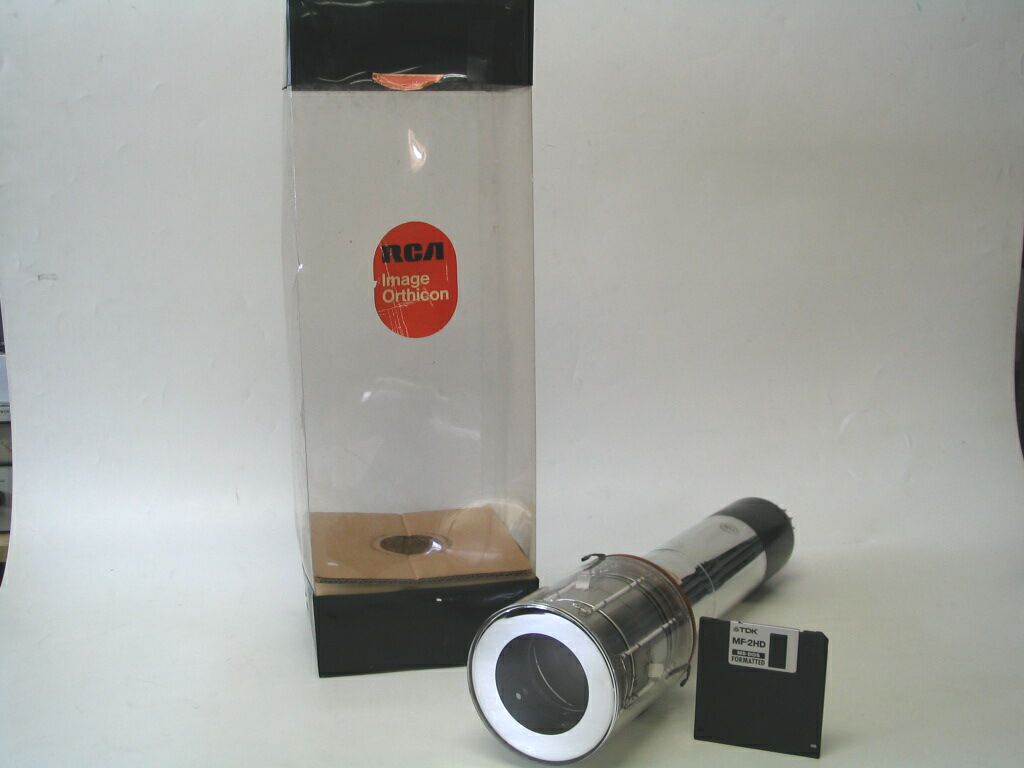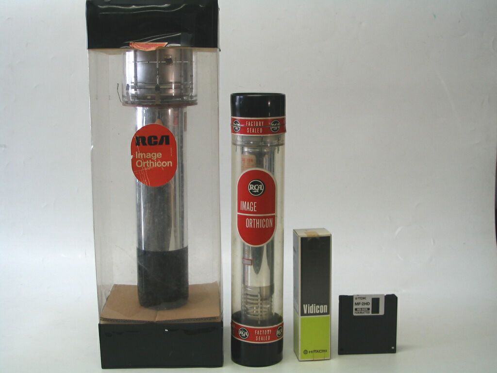 TUBI ORTHICON E VIDICON NEGLI IMBALLI ORIGINALI in confronto con floppy disk da 3,5" |